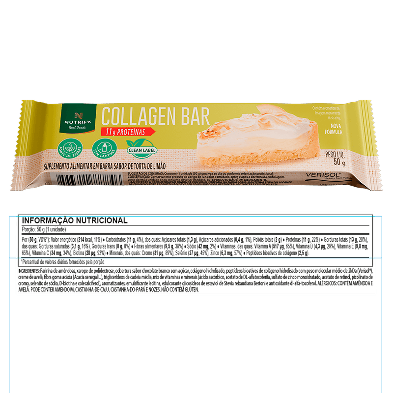 Farinha de amêndoas, xarope de polidextrose, cobertura sabor chocolate branco sem açúcar, colágeno hidrolisado, peptídeos bioativos de colágeno hidrolisado com peso molecular médio de 2kDa (Verisol®), creme de avelã, bra goma acácia (Acacia senegal L.), triglicerídeos de cadeia média, mix de vitaminas e minerais (ácido ascórbico, acetato de DL-alfatocoferiIa, sulfato de zinco monoidratado, acetato de retinol, picolinato de cromo, selenito de sódio, D-biotina e colecalciferol), aromatizantes, emulsicante lecitina, edulcorante glicosídeos de esteviol de Stevia rebaudiana Bertoni e antioxidante dl-alfa-tocoferol. ALÉRGICOS: CONTÉM AMÊNDOA E AVELÃ. PODE CONTER AMENDOIM, CASTANHA-DE-CAJU, CASTANHA-DO-PARÁ E NOZES. NÃO CONTÉM GLÚTEN.