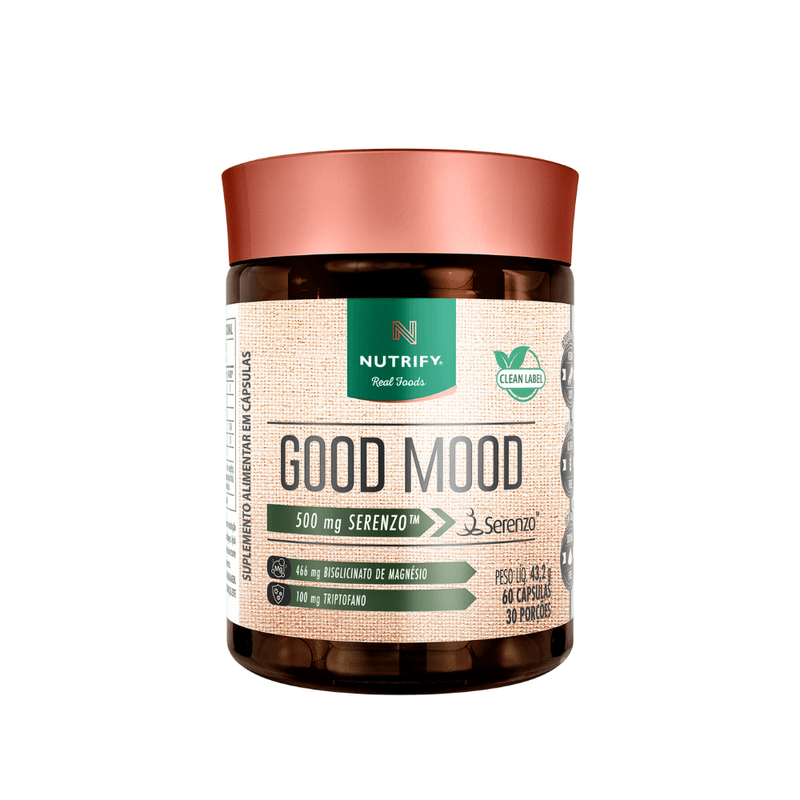 Good Mood Nutrify reúne cinco ativos com atuação comprovada em mecanismos importantes de regulação dos níveis de estresse e ansiedade: SERENZO™ (D-limoneno), L-triptofano, bisglicinato de magnésio e fosfato de piridoxal (vitamina B6).